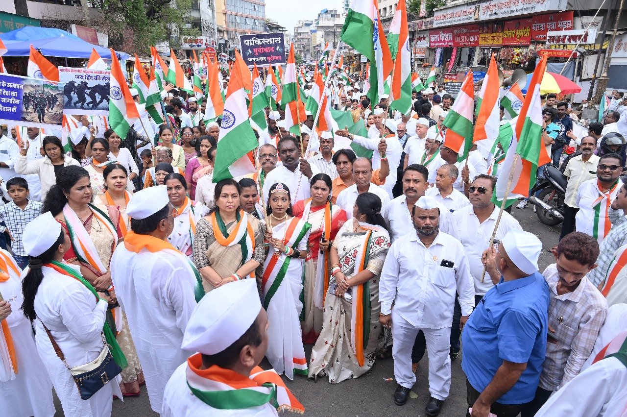 पुणे : ऑपरेशन सिंदूरच्या यशानंतर भारतीय सेनेच्या सन्मानार्थ पुणे शहर जिल्हा काँग्रेस कमिटीच्या वतीने पुणे शहर जिल्हा काँग्रेस कमिटीचे अध्यक्ष अरविंद शिंदेयांच्या नेतृत्वाखाली व महाराष्ट्र राज्याचे सहप्रभारी बी. एम. संदिप यांच्या प्रमुख उपस्थितीत आज काँग्रेस भवन ते लोकमान्य टिळक पुतळा, मंडई, पुणे पर्यंत ‘‘तिरंगा यात्रा’’ आयोजित करण्यात आली होती. सदर रॅलीमध्ये पक्षातील वरिष्ठ नेतेमंडळी, पदाधिकारी व कार्यकर्ते त्याचबरोबर नागरिकही मोठ्या संख्येने सहभागी झाले होते.