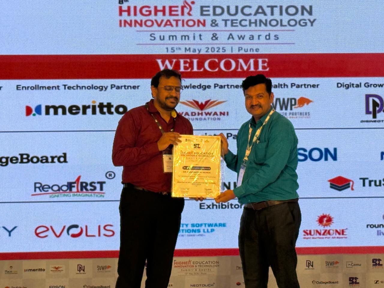 पुणे :लोहेगाव येथील के.ई. सोसायटीच्या राजाराम बापू इन्स्टिट्यूट ऑफ टेक्नॉलॉजी (पॉलिटेक्निक), प्राचार्य डॉ. काशिनाथ एच. मुंडे यांना “प्राचार्य ऑफ द इयर फॉर इन्स्टिट्युशनल एक्सलन्स” हा राष्ट्रीय सन्मान प्रदान करण्यात आला आहे.हा पुरस्कार ८ व्या हायर एज्युकेशन इनोव्हेशन अँड टेक्नॉलॉजी समिट अँड अवॉर्ड्स या कार्यक्रमात देण्यात आला. कार्यक्रमाचे आयोजन प्लस नाईन वन मीडिया तर्फे पुणे येथे करण्यात आले होते.या पुरस्काराचा उद्देश शिक्षण संस्थांमध्ये उत्कृष्ट व्यवस्थापन, नावीन्यपूर्ण उपक्रम आणि विद्यार्थ्यांच्या सर्वांगीण विकासासाठी प्राचार्यांच्या योगदानाचा गौरव करणे आहे. डॉ. मुंडे यांनी गेल्या काही वर्षांत तंत्रशिक्षण क्षेत्रात केलेल्या उल्लेखनीय कामगिरीची दखल घेत त्यांना हा सन्मान देण्यात आला.