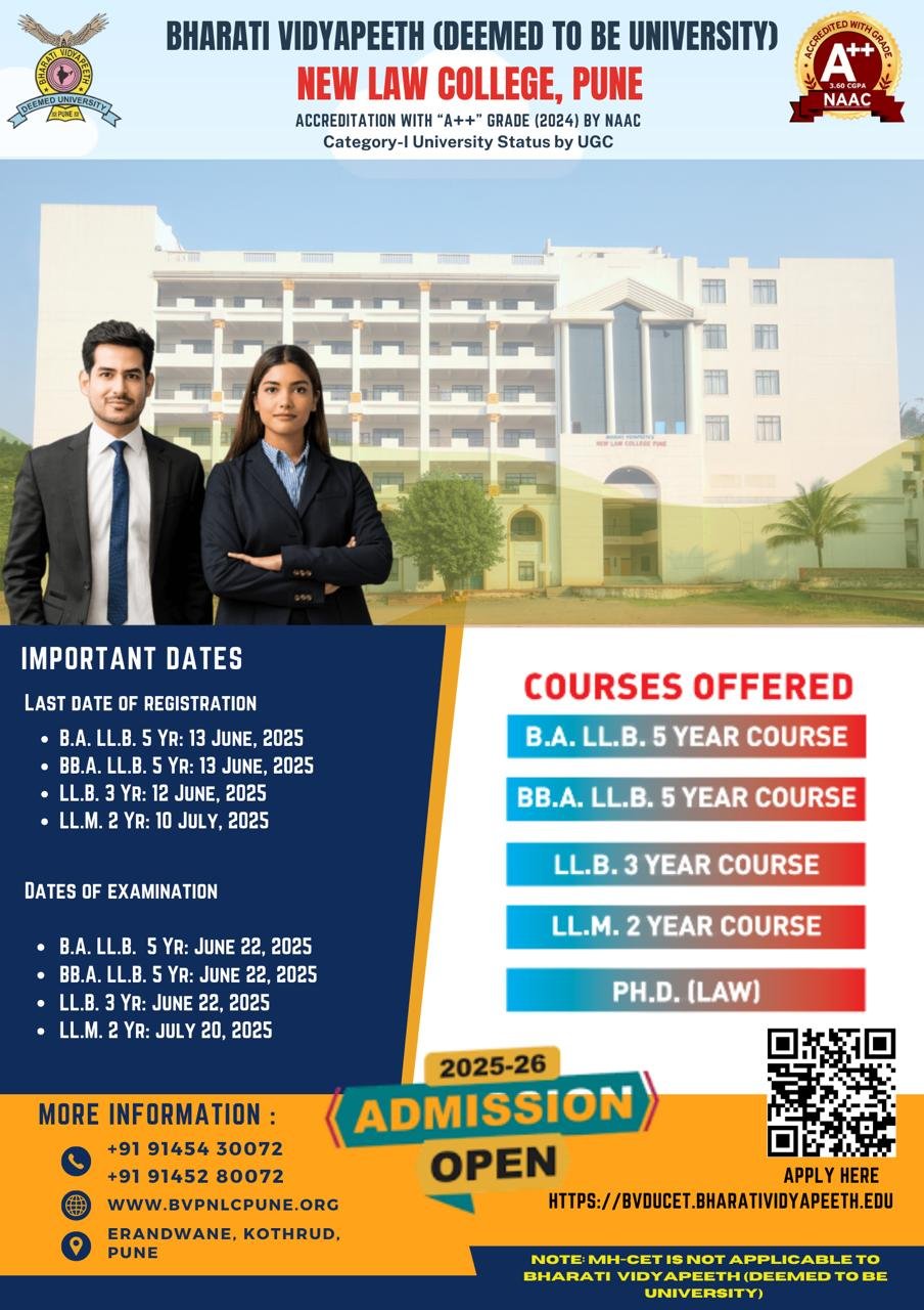 भारती विद्यापीठ न्यू लॉ कॉलेजच्या अभ्यासक्रमांची घोषणा पुणे : भारती विद्यापीठ अभिमत विद्यापीठाच्या न्यू लॉ कॉलेजने शैक्षणिक वर्ष २०२५-२६ साठी बीए एलएलबी,बीबीए एलएलबी,एलएलबी,एलएलएम या अभ्यासक्रमांची घोषणा केली आहे.अधिक माहिती ९१४५४३००७२